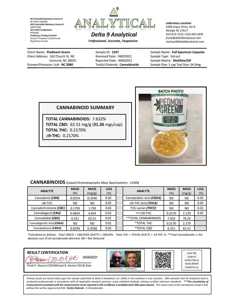 Piedmont Green’s full-spectrum CBD oil formula all packed within an organic gelatin capsule. This is perfect for those who do not enjoy the texture of oils and would like an easy method to include CBD in their daily lifestyle! These capsules are dosed like our 750mg tincture making them effective for any cannabinoid user.